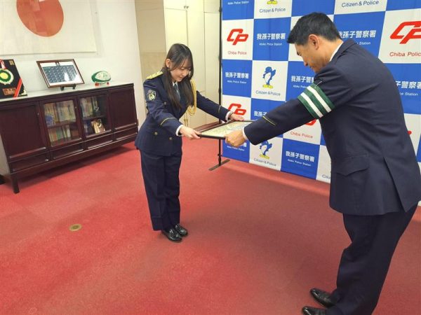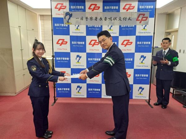 本校で普段実施している防犯啓発活動ボランティアが高く評価され、生徒会長の澤村みさきさんが一日署長に任命されました。